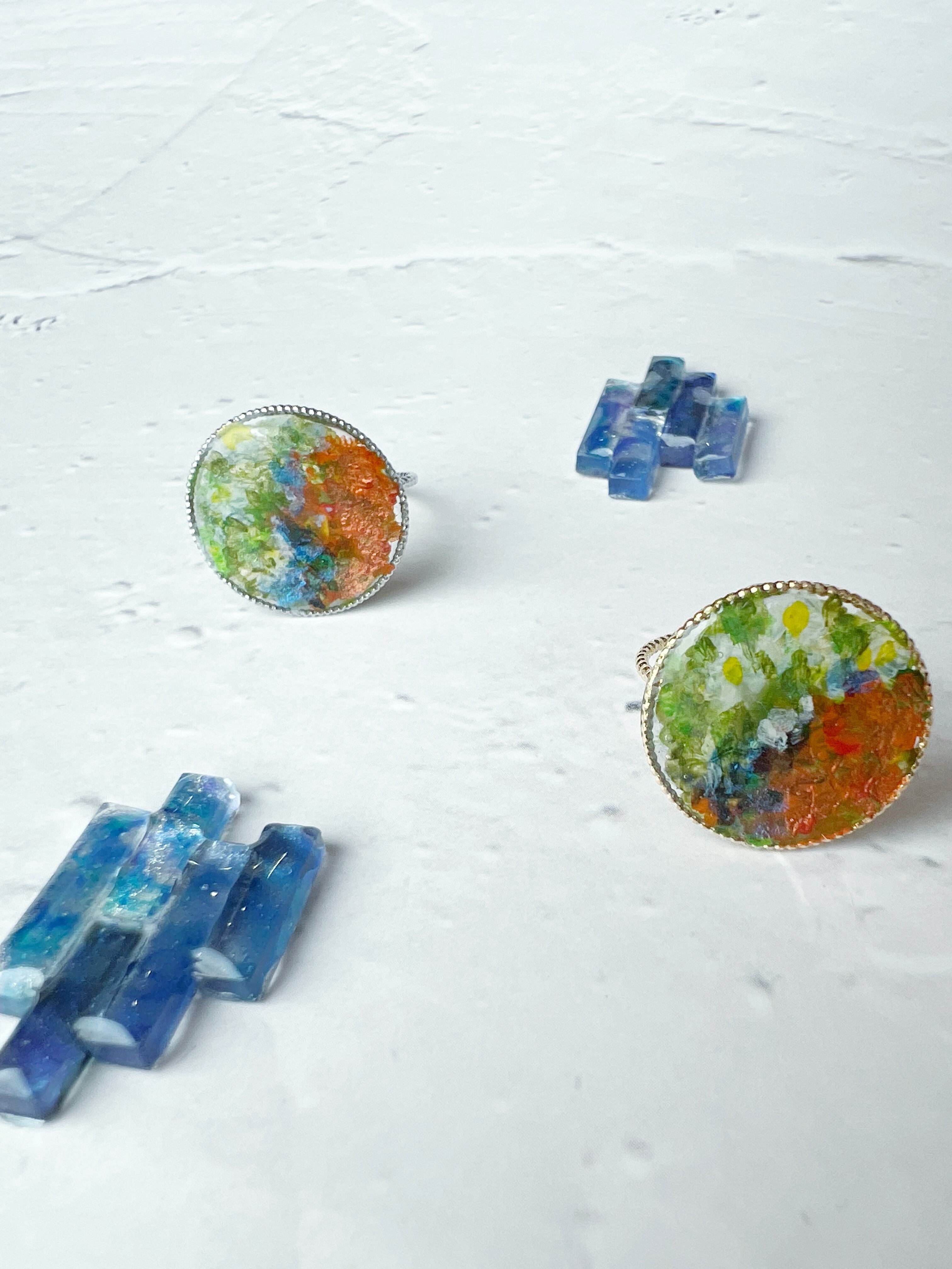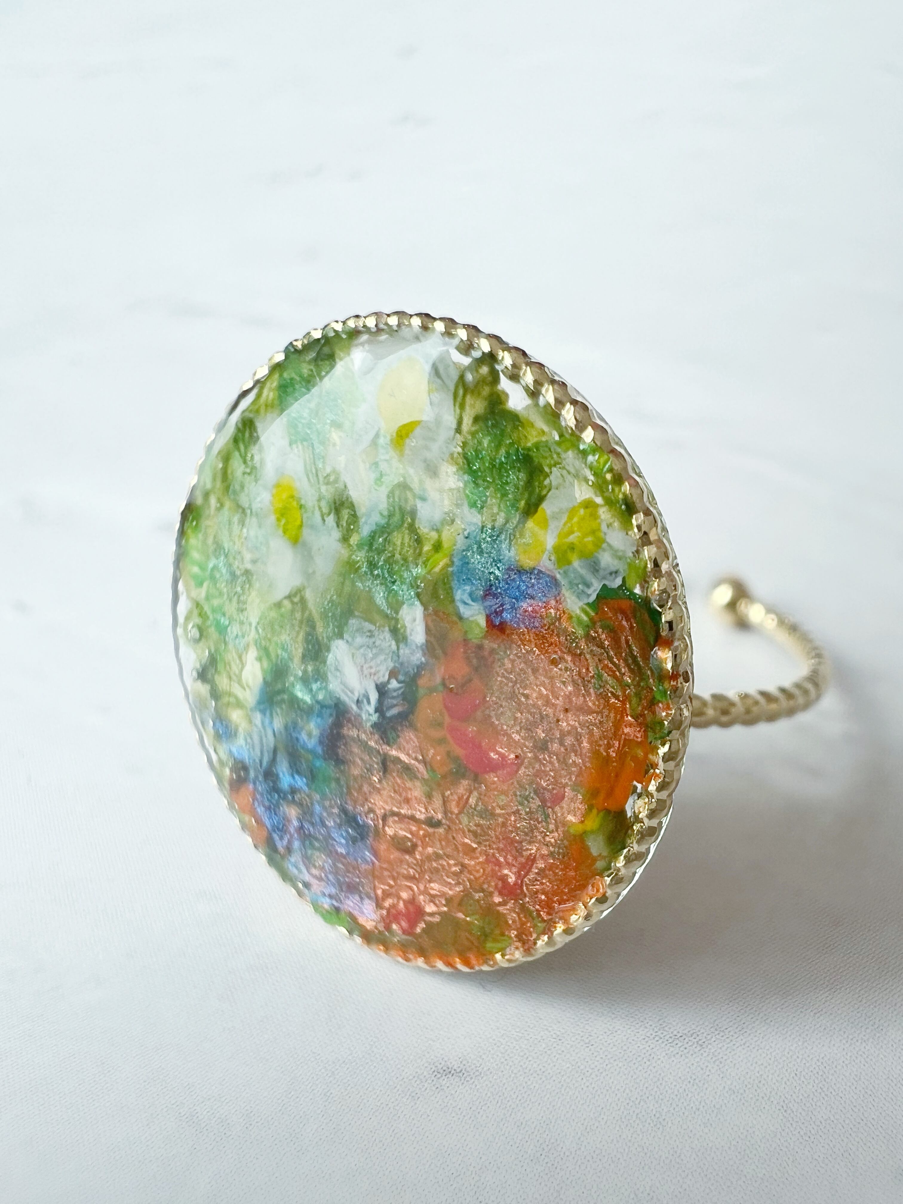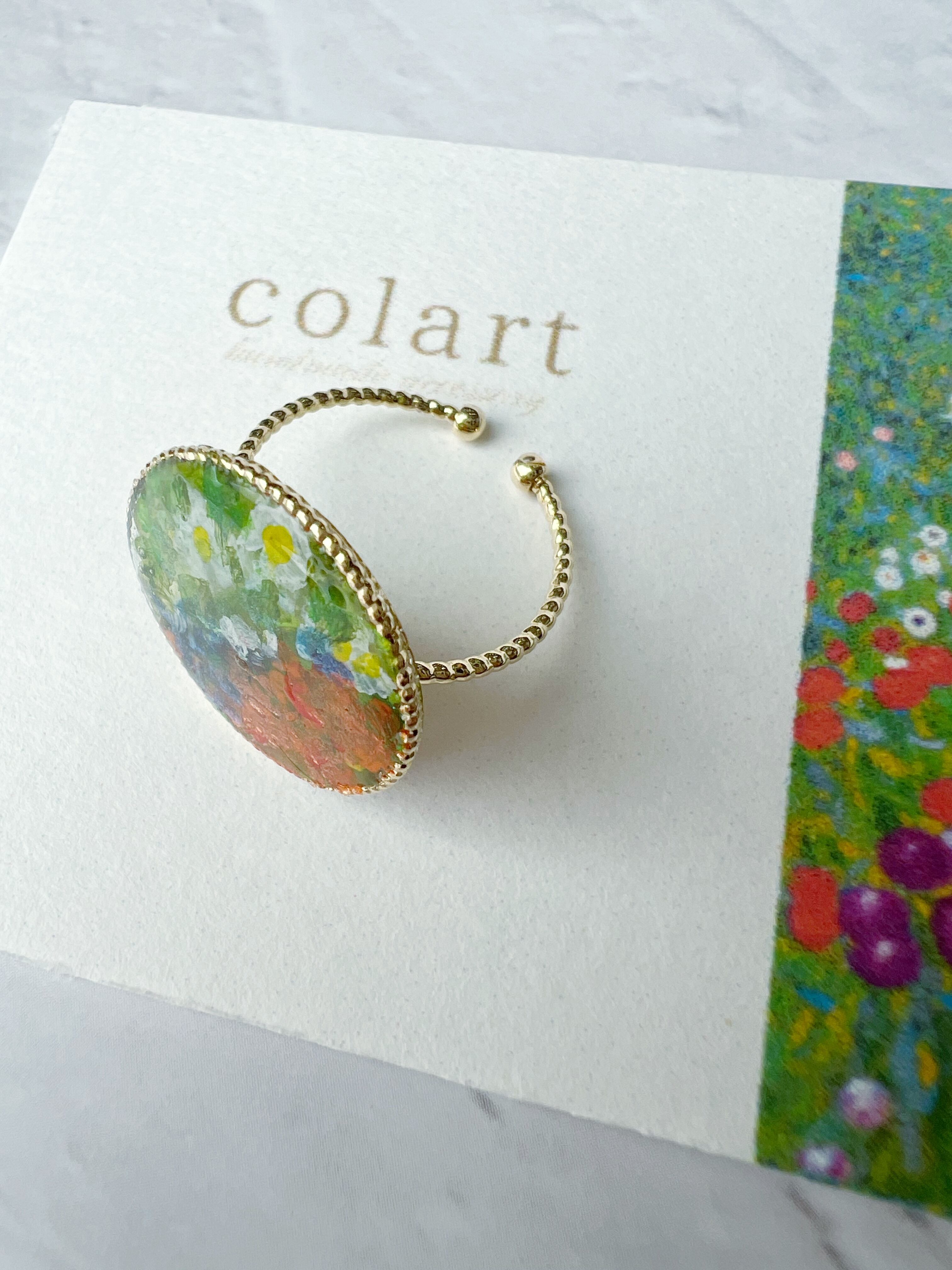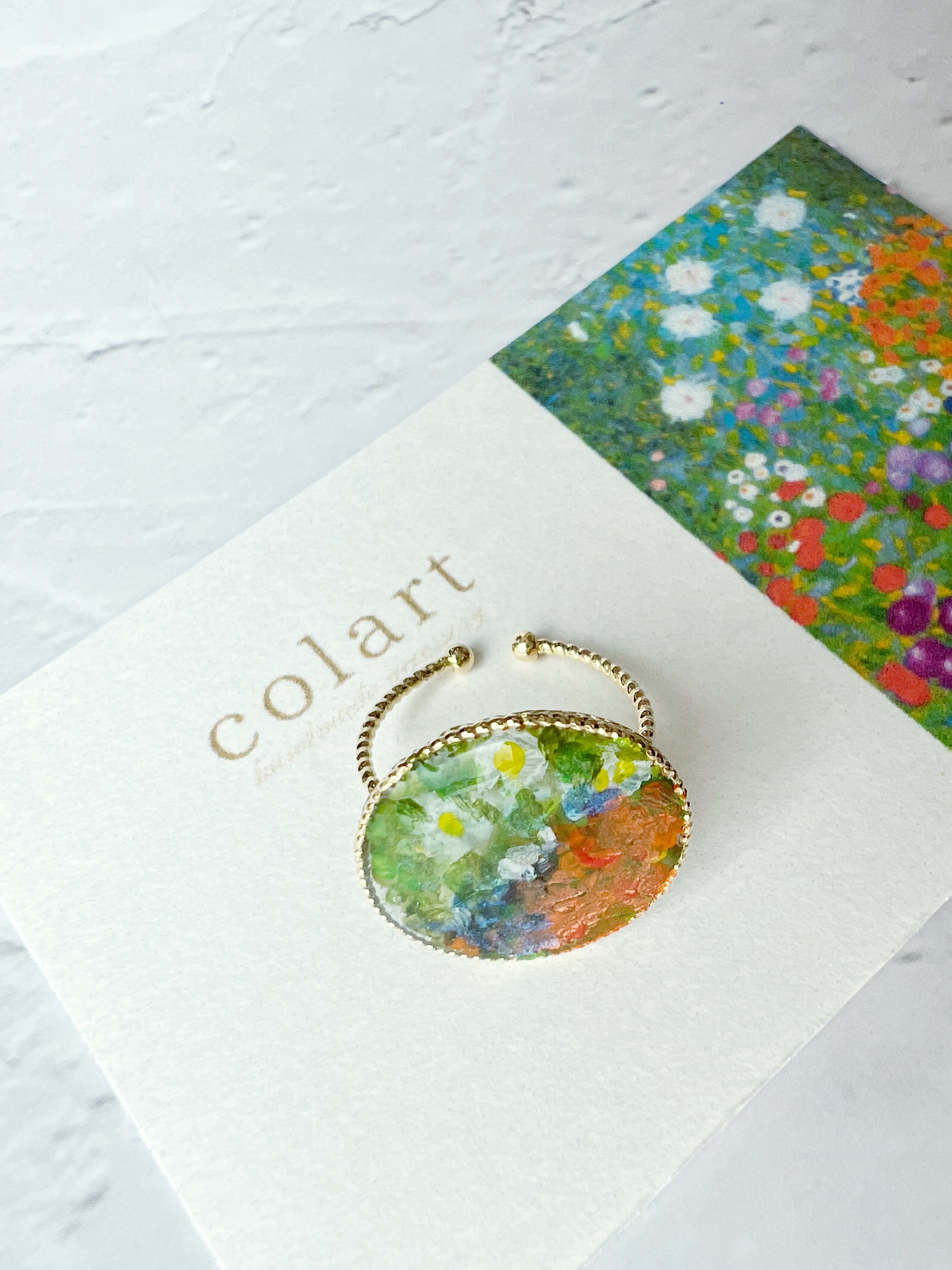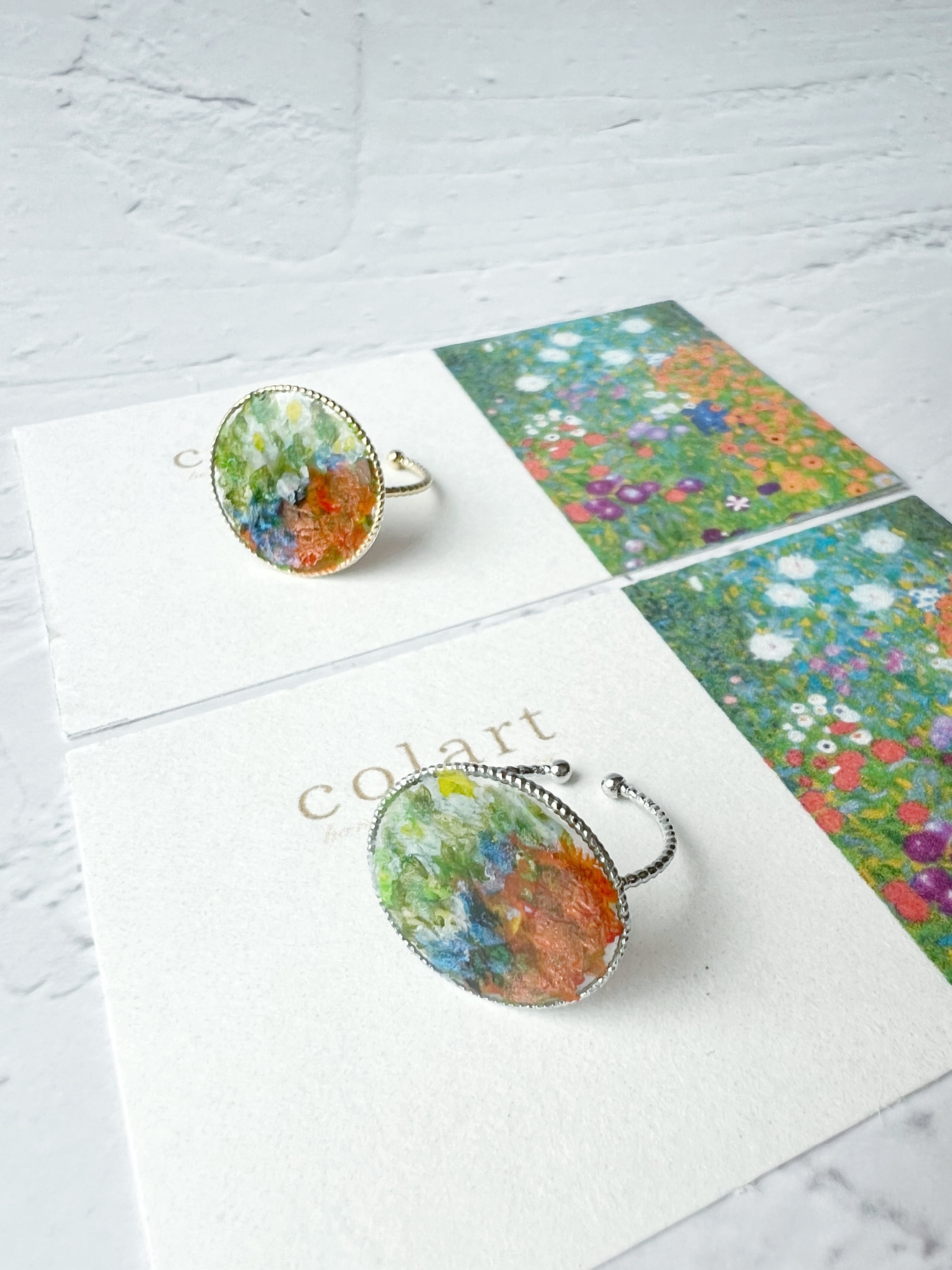 名画『フラワーガーデン』(グスタフ・クリムト)をモチーフに、絵の具を混ぜて一つひとつ丁寧に描きました。colart的、絵画の中の“ここが一番かわいい!”と思った部分を切り取り、繊細なリングに閉じ込めています。