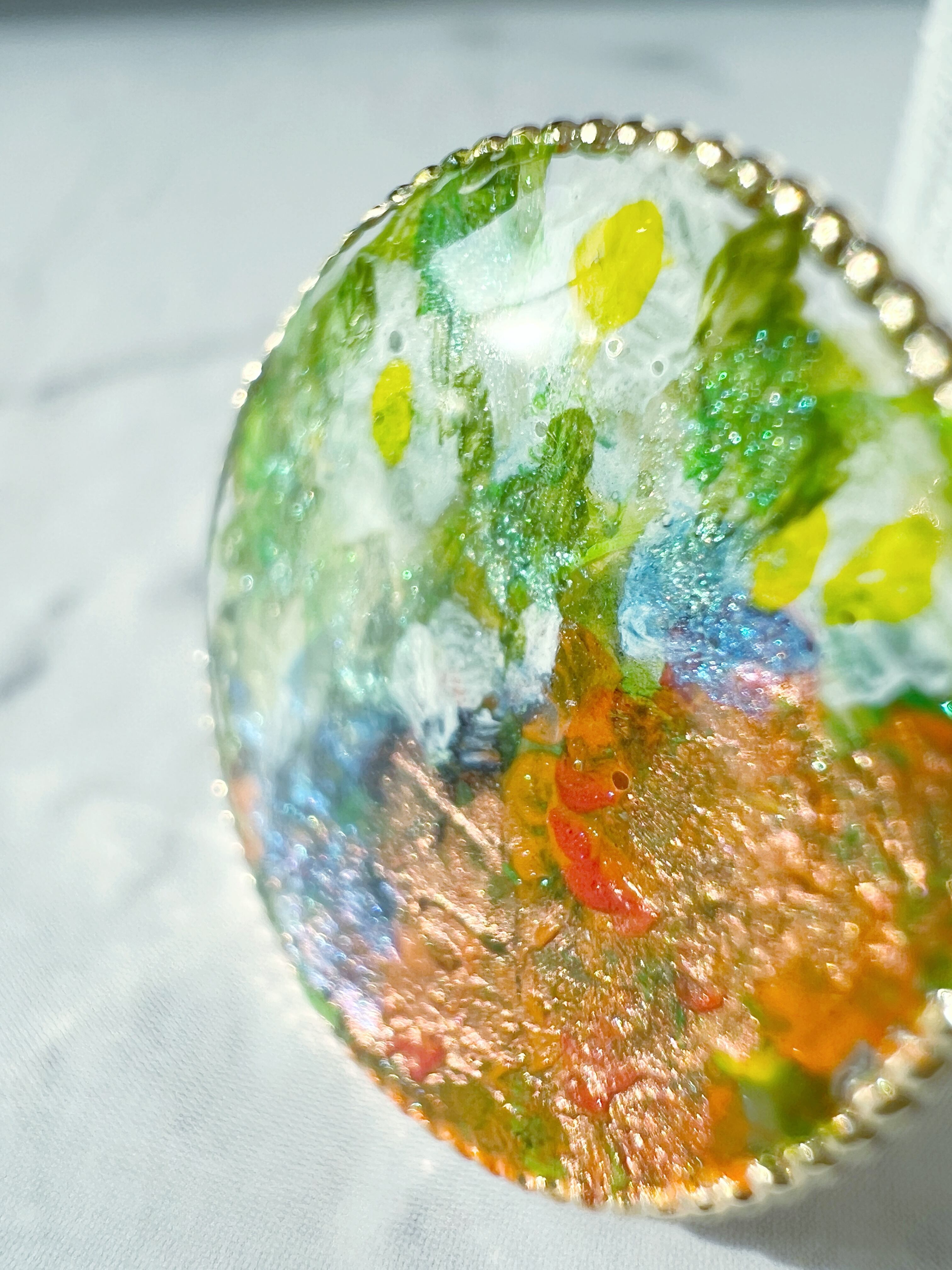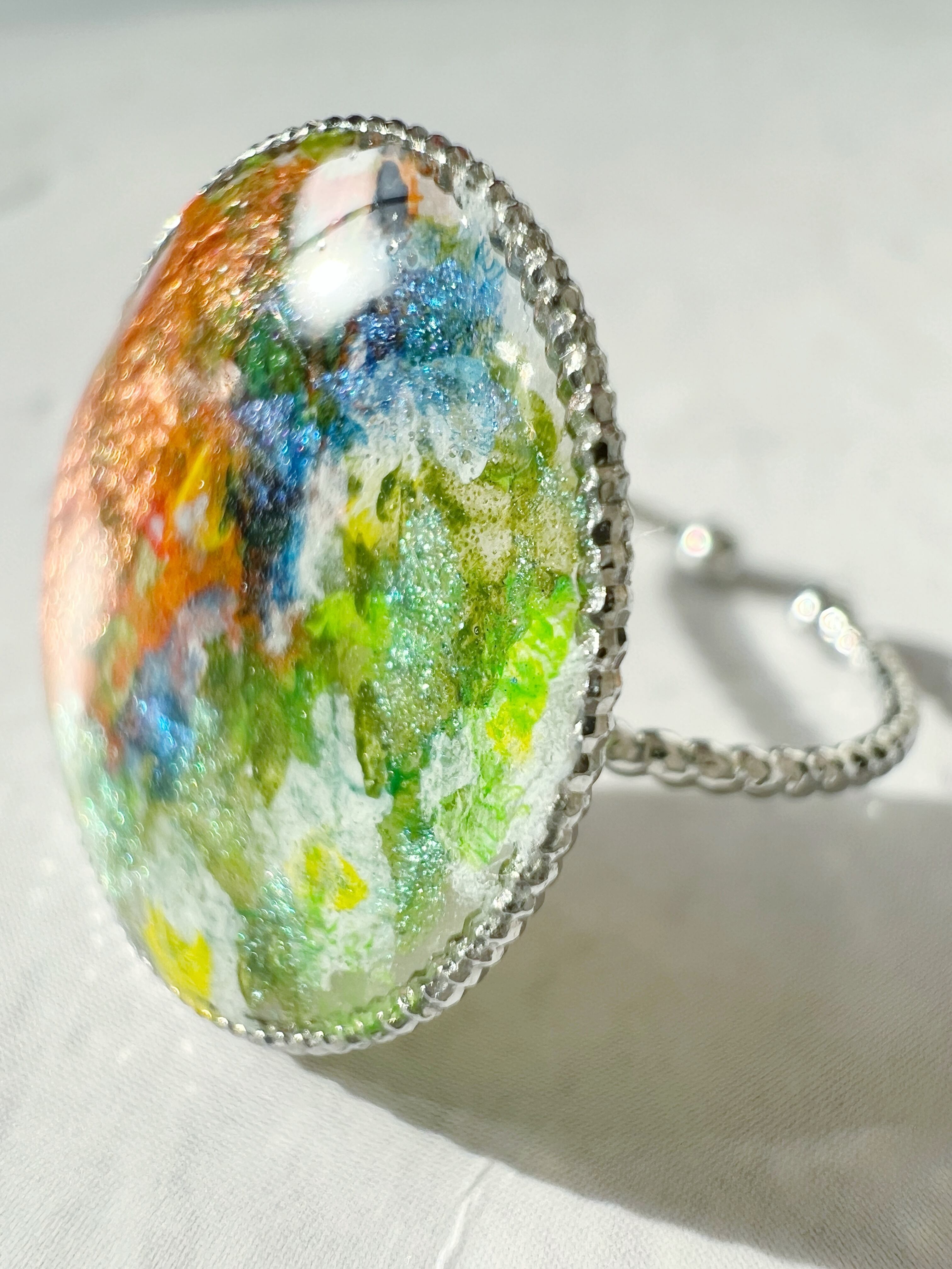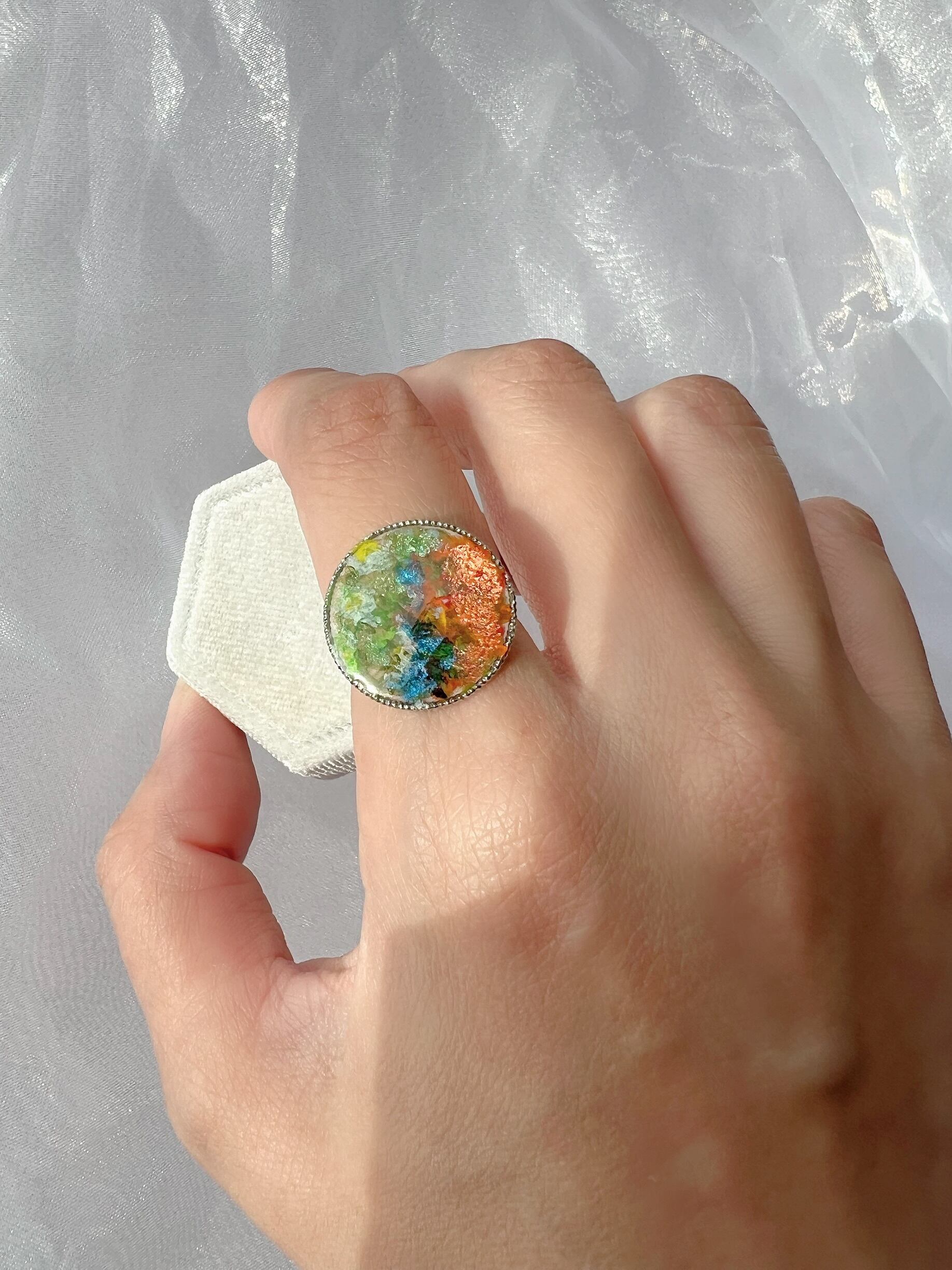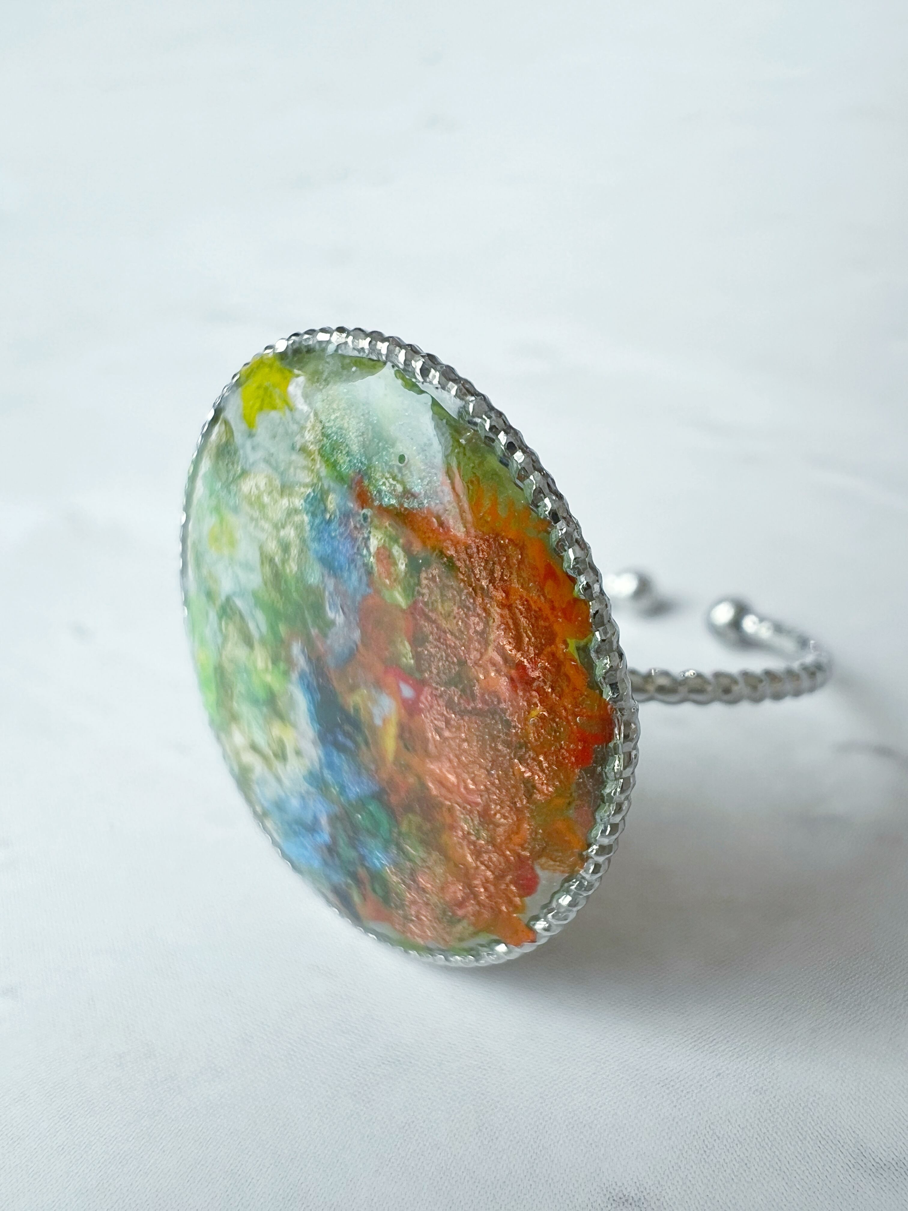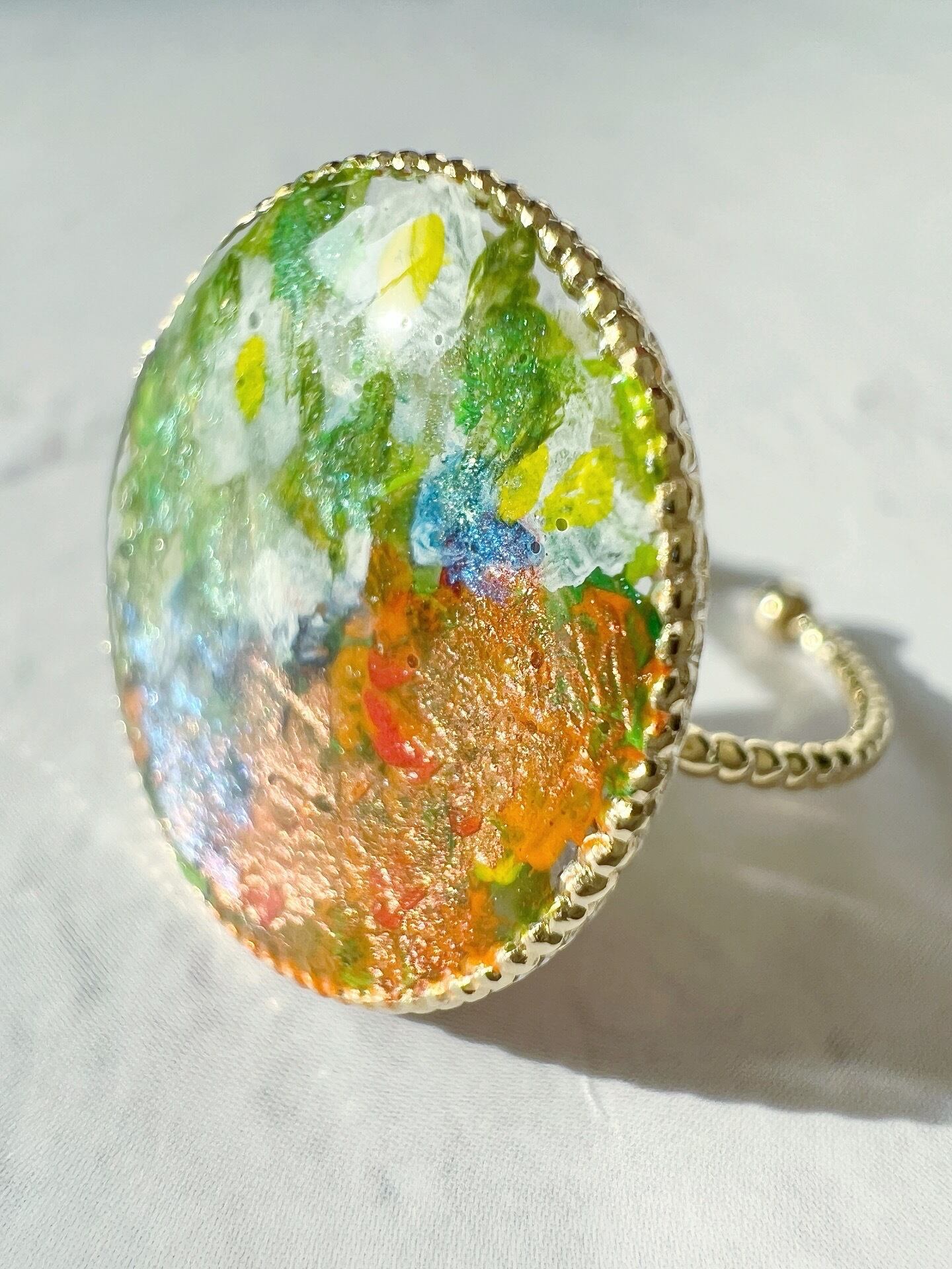 名画『フラワーガーデン』(グスタフ・クリムト)をモチーフに、絵の具を混ぜて一つひとつ丁寧に描きました。colart的、絵画の中の“ここが一番かわいい!”と思った部分を切り取り、繊細なリングに閉じ込めています。