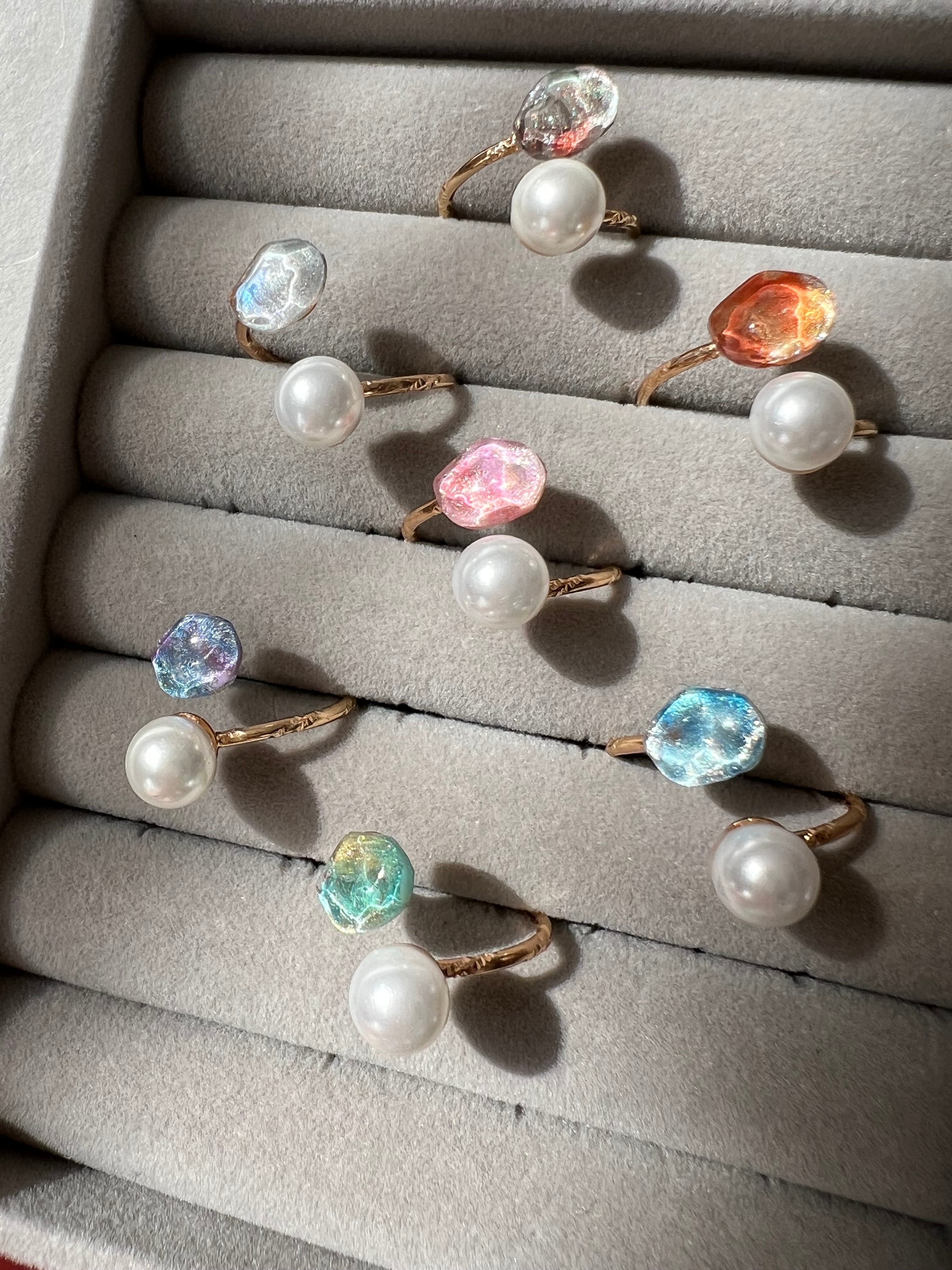 光を受けてきらめく小さな鉱物のようなアクセントと上品なパールを組み合わせたフォークリングです。